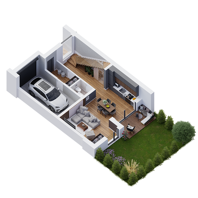 Zamieszkasz w miejscu, gdzie wszystko funkcjonuje z myślą o Twoim komforcie. Ogrzewanie podłogowe zapewni przyjemne ciepło pod stopami w każdym pomieszczeniu. Rekuperacja zadba o świeże powietrze w domu przez cały rok. Duże przeszklenia typu HST wprowadzą do wnętrz mnóstwo naturalnego światła i otworzą przestrzeń na ogród, a elektryczne rolety dadzą Ci poczucie prywatności. Ponadto segmenty oddzielono akustycznie, więc w swoim domu możesz liczyć na ciszę i spokój.